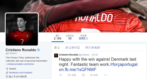 C罗在Twitter上也有3050万名粉丝,他同样是推特上粉丝数量最多的运动员。