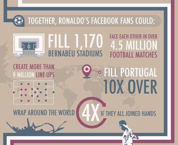 他的粉丝加在一起,能装满1170个伯纳乌球场(皇家马德里俱乐部的主场),能排出900万套首发阵容,踢450万场比赛,能填满10个葡萄牙,如果粉丝们手拉手,那他们能绕地球4圈。