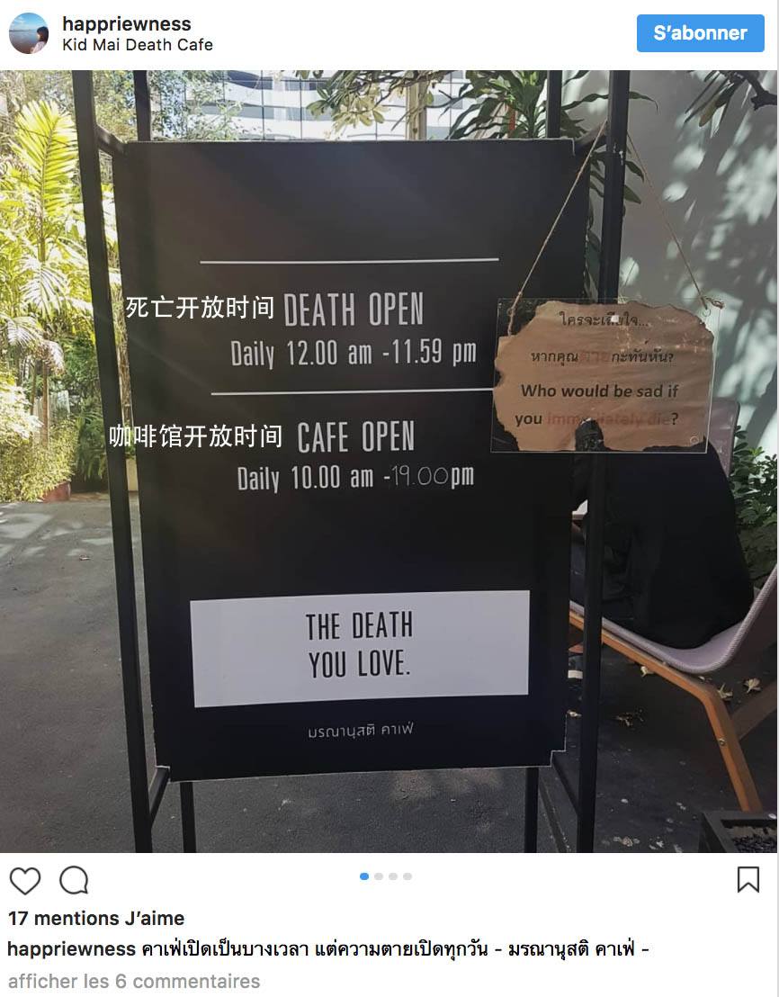 泰国曼谷新开的Kid-Mai Death Cafe,是一家把哲学思考贯彻到每一个角落的咖啡馆,从门口的招牌就开始提醒你:死亡24小时不打烊。