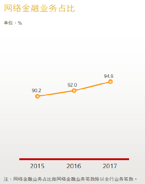 2017年末,本行营业网点16.092家,自助银行27.196个,自动柜员机95,043台,自动柜员机交易额118.611亿元。2017年,网络金融交易额646万亿元,网络金融业务笔数占全年业务笔数比上年提高2,86个百分点至94.8690。