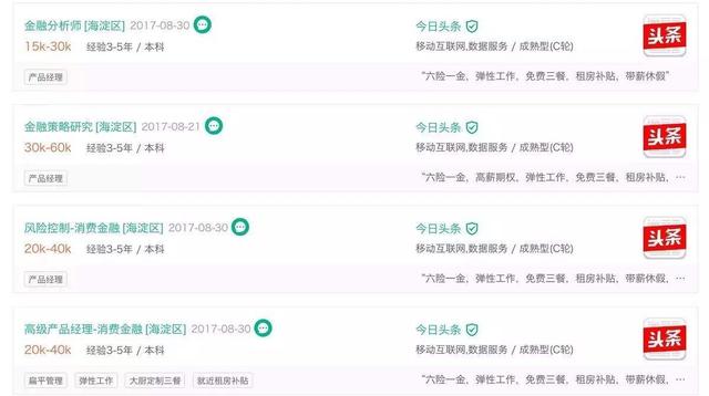 2017年8月,今日头条在招聘平台上发布金融相关岗位,包括产品经理-消费金融、风险控制-消费金融、金融策略研究、金融分析师等,部分职位还特意标明“需要熟悉小额现金贷产品,并对此类产品的目标客户群有一定了解,熟悉了解个人信贷风险要点”。又有消息显示,当时头条正在向宁夏银行申请网络小贷牌照。