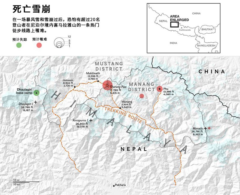 推广安全登山的非营利组织尼泊尔喜马拉雅山救援协会(Himalayan Rescue Association Nepal)的秘书长巴桑特·B·哈马尔(Basant B. Hamal)表示,周二下午,风暴来袭时,可能有多达200名登山者,从海拔1.8万英尺(约5500米)的坨龙垭峰,出发前往海拔1.2万英尺的穆格蒂纳特庙(Muktinath)。
