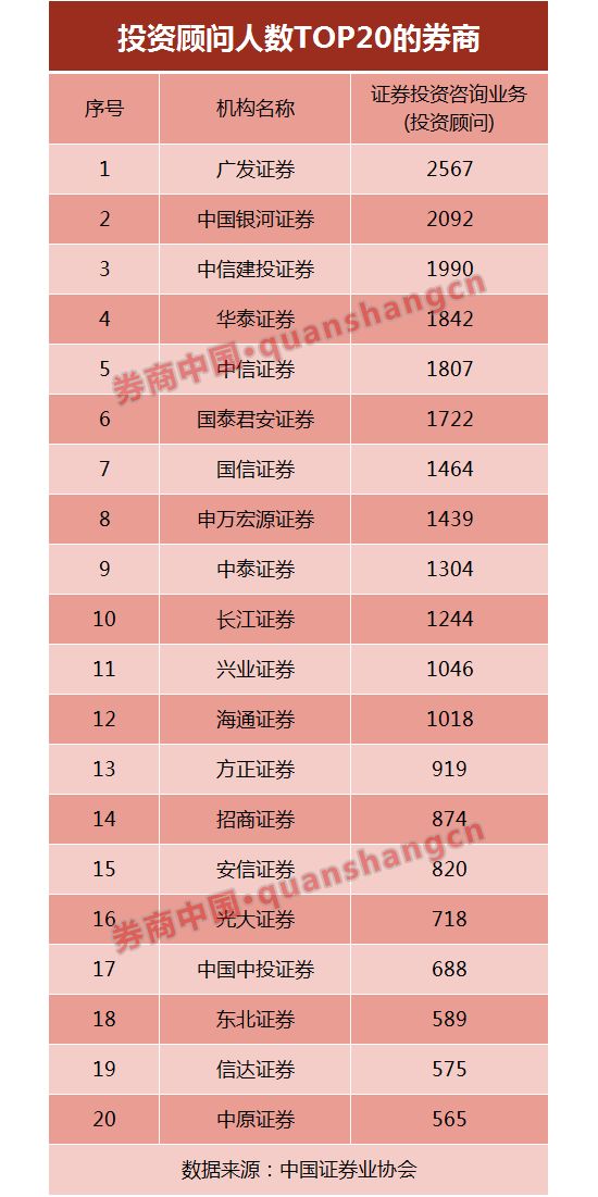 中证协最新数据显示,截至目前,100家券商在中证协注册在案的证券投顾人数为41153人。这100家券商中,投顾人数最多的5家公司为广发证券、中国银河证券、中信建投证券、华泰证券和中信证券,它们最新的投顾人数分别为2567人、2092人、1990人、1842人和1807人。