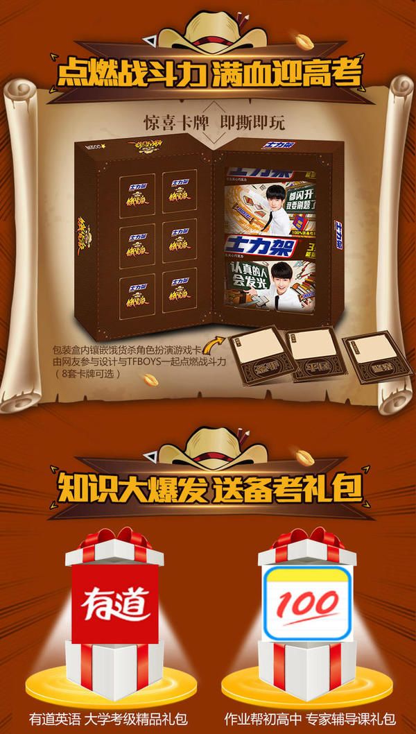 为和粉丝互动,士力架推出“士力架饿货杀典藏款”,其中包括有明星周边产品,还举办投票,深度利用TFBOYS的粉丝效应。同时赠送作业帮APP和有道APP提供的备考礼包。