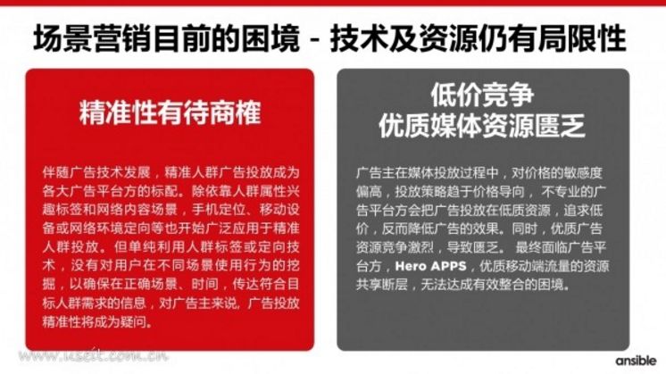 在当前的市场环境下,快消品必须尽快由以往单一功能定位的产品理念,诉求点模糊、场景模糊的营销理念,转向精准的场景定位、精准的场景设计、精准的场景营销。场景营销目前依然面临技术及资源仍有局限性的困境:精准性有待商榷;低价竞争优质媒体资源匮乏。