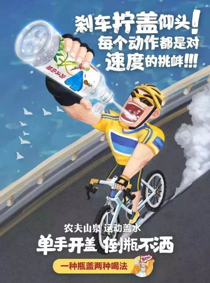 同时,农夫山泉联手支付宝和共享单车,进行跨界营销,推出了“共享天然,绿色出行”的主题活动。推出了一组画风非常喜感的生活场景海报。