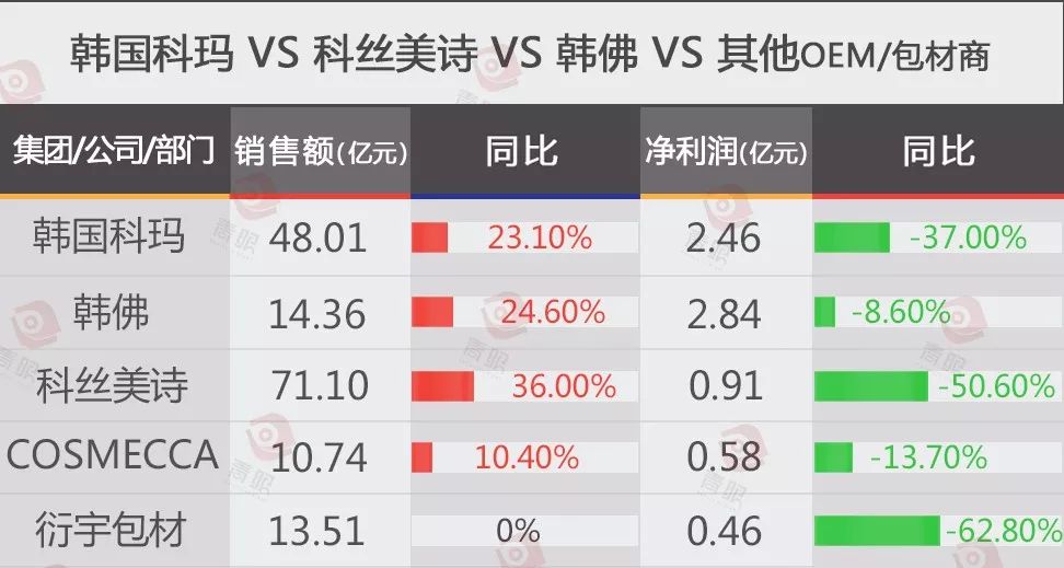 韩国科玛仍然是韩国排名第一的化妆品ODM/OEM企业,在韩妆业绩大范围萎靡的去年,其净利润也出现下降,但降幅为同行业企业中最小,其它代工厂或包材企业净利润均呈双位数下滑。
