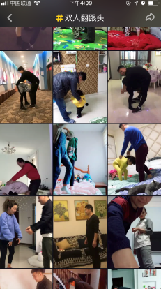 记者从用户上传的视频中看到,“双人翻跟头”的动作是,两人面对站立,一方低头弯下腰,将双手从自己腿中间伸出;另一方抓住其伸出的双手,用力向上翻转180度,成功的话则完美完成骑腰抱,不成功的话则摔倒在地。
