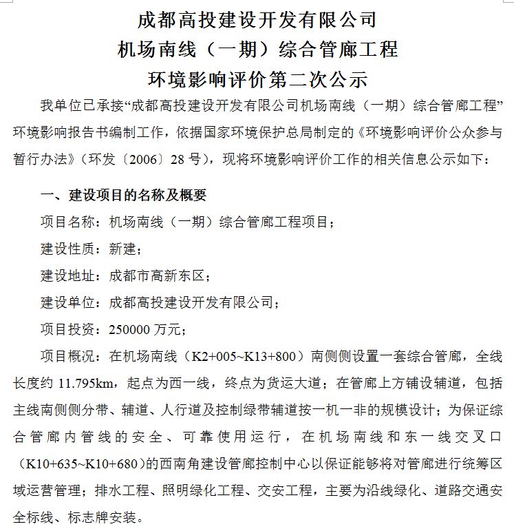 机场南线综合管廊:根据环评公示,在机场南线南侧将设置一套综合管廊,全线长度约11.795km,起点为西一线,终点为货运大道;在管廊上方铺设辅道,包括主线南侧侧分带、辅道、人行道及控制绿带辅道按一机一非的规模设计;进行排水工程、照明绿化工程、交安工程,主要为沿线绿化、道路交通安全标线、标志牌安装。