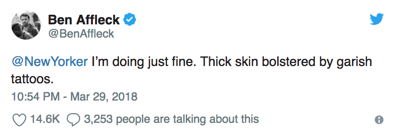 在多年对自己背后有文身这件事矢口否认之后,蝙蝠侠扮演者本•阿弗莱克终于发推直面自己的黑历史。在此之前,《纽约客》发表了一篇题为《本•阿弗莱克深重的悲伤》的长篇报道,着重分析了他背后的这幅“辣眼睛”的文身究竟是何含义。辅以两位前任的评价和一系列对中年危机的暗示,本•阿弗莱克或成为历任蝙蝠侠中离你我油腻中年最近的人。