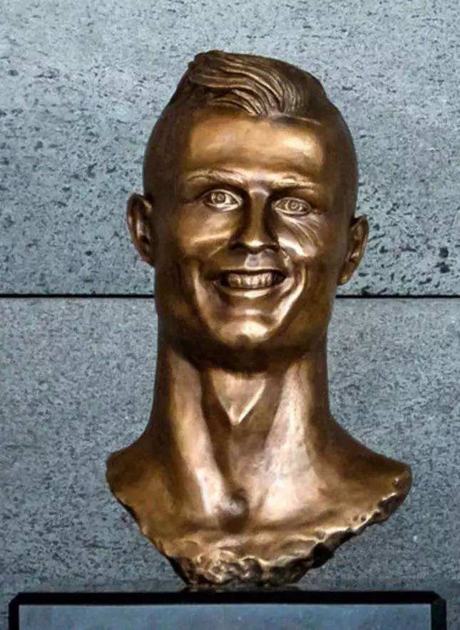 去年4月,C罗家乡马德拉将其机场正式更名为克里斯蒂亚诺•罗纳尔多机场,并在更名仪式上展示了这尊笑起来尴尬而不失礼貌的铜像。其独特的造型艺术风格打动了大批网友,深受粉丝们喜爱,并被做成了各种表情包(划掉)。