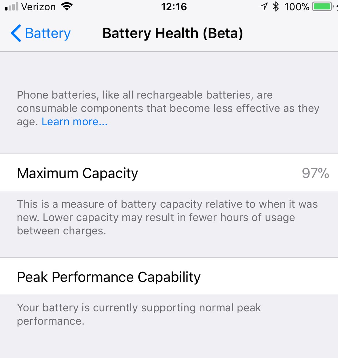 就像上图所显示的,这位用户的电池最大蓄电量为出厂时的97%,仍然很健康。而如果这一百分比降到90%以下,你可能就要考虑换电池了。