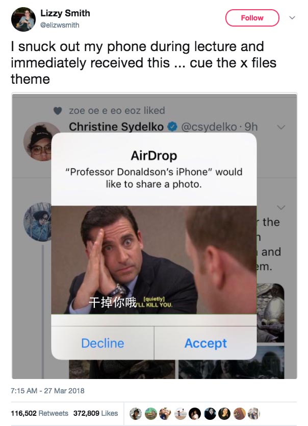 在长期与学生斗智斗勇的过程中,教授们开发出了新武器:AirDrop。