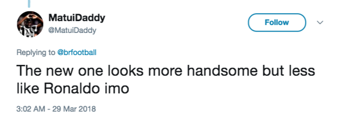 网友:我感觉新的这个看起来帅了很多但是更不像罗纳尔多了