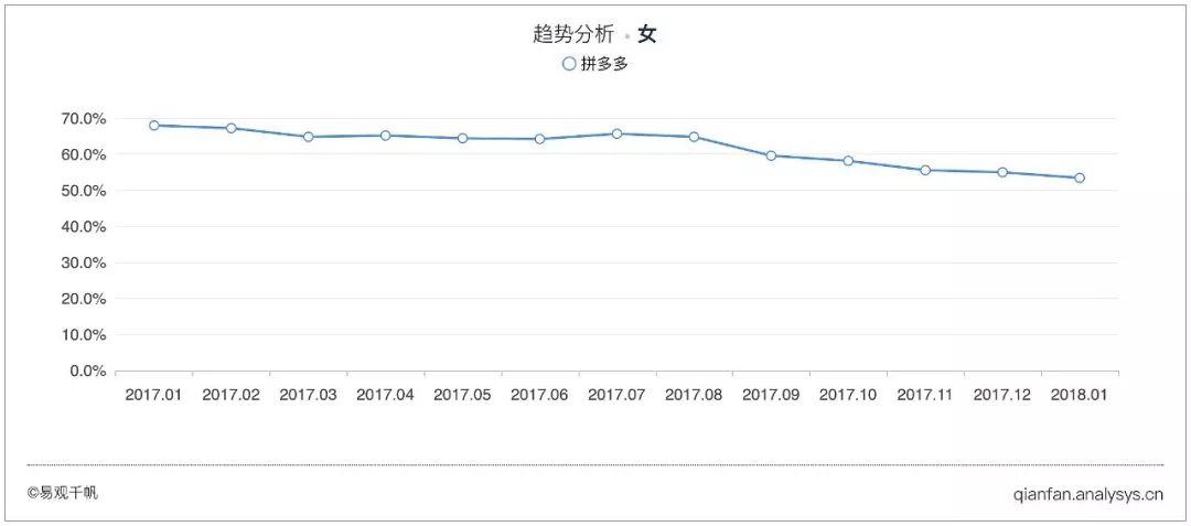 但随着用户基数成雪球式的裹大,用户运营就要开始从女性用户转向全网用户。从易观千帆对拼多多移动APP的数据监测可以看到,女性用户占比从2017年1月的68%下降到2018年1月的53 .4%,随着平台用户不断增长和沉淀,拼多多用户在用户性别及地域分布上开始逐步均衡稳定,平台商品品类的扩大,就男女性别偏好而言就不太明显。