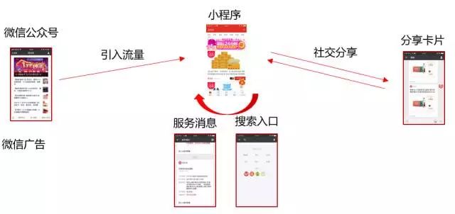 通过传统的微信公众号和微信广告为小程序引流,老客通过服务消息以及搜索入口再次进入,优化后的商品卡片通过社交分享扩散。拼多多CTO陈磊曾在微信公开课上具体分享了一下三个运营细节: