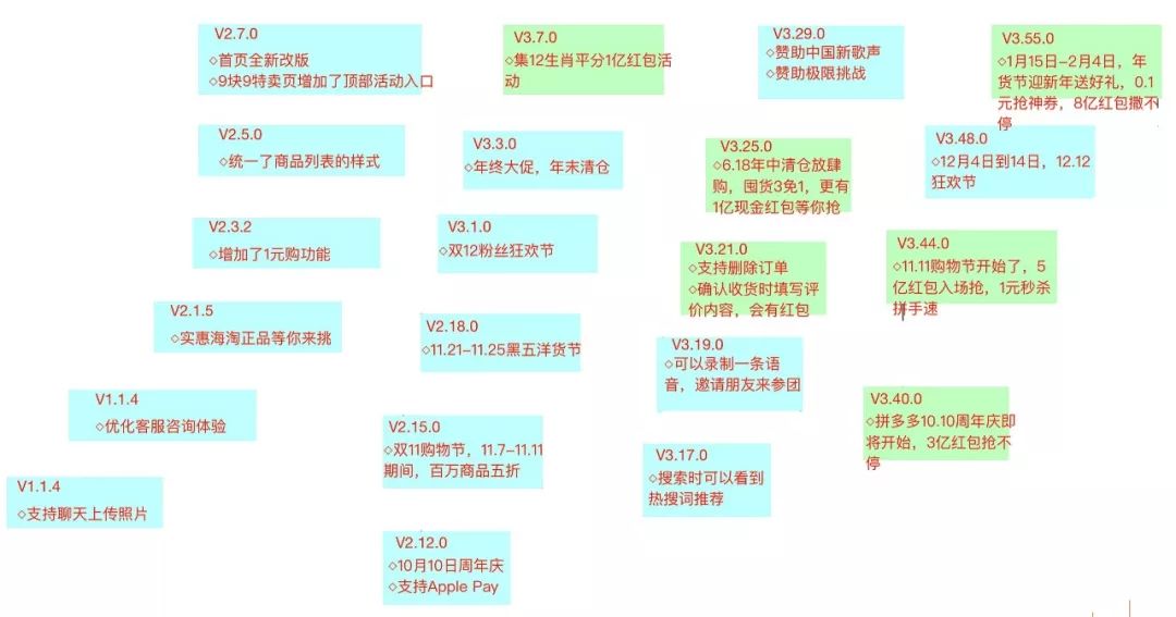 在不到3年时间坐拥3亿用户的拼多多,APP当前对外迭代升级次数已超过100次,平均下来每8天就有一次升级更新。虽然说是游戏平台孵化,有技术人力优势,但如此密集的产品更新速度,可以说是团队在高速超负荷运转。
