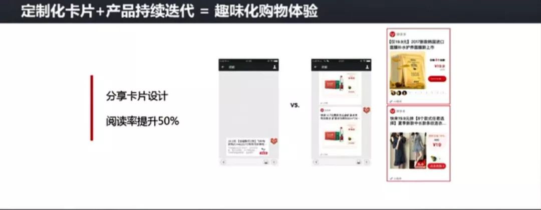 ● 一是由于图文结合更直观,小程序的分享卡片比公众号文章转发效果更好,通过不断调整图文设计阅读率提高了50%;