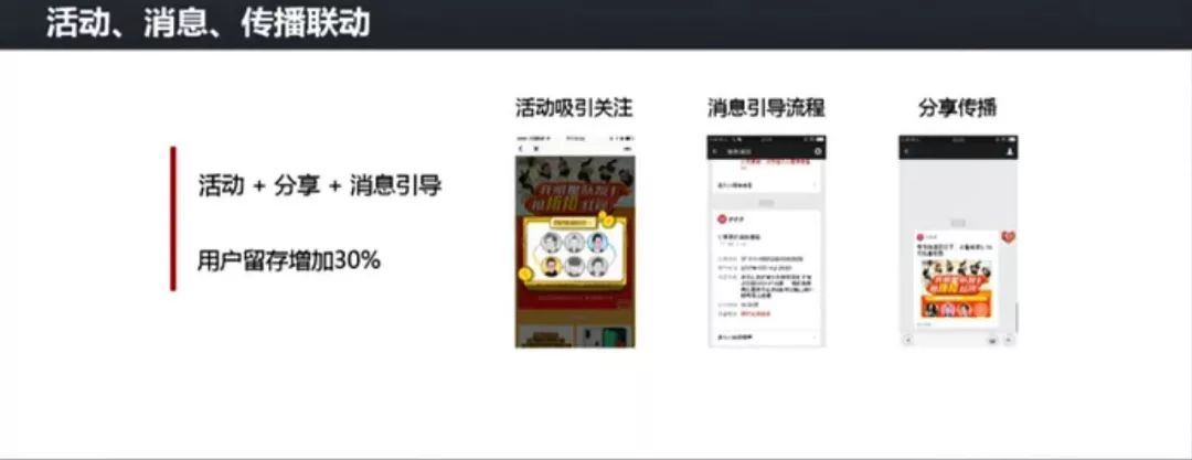 ● 二是针对小程序留存难的问题,要把小程序结合公众号内容、推送消息和朋友圈传播联动考虑,三者优化后留存率提升了 30%。