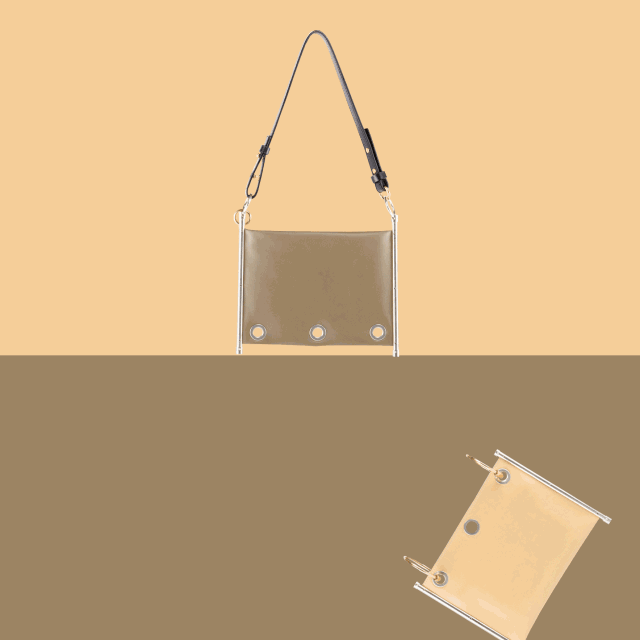 它的灵感来自于自行车的车筐,叫"车筐包"应该更合适。用来束住包扣的圆形树脂手柄不但拿起来舒服,还很有型,方圆结合在一起,特别有几何碰撞的美感。