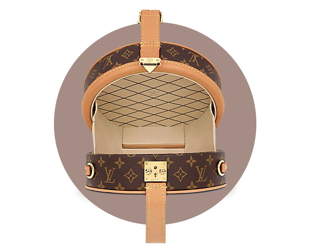 它由LV的经典帽盒演变过来,保留了帽盒硬朗的材质,非常挺刮,还加了个底座让它可以站起来。