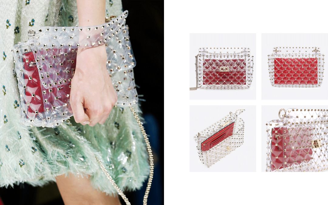 这款包也是出过一阵子,最近被带火的款式。之前宇博写过一篇关于PVC材质的文章,里面有一款就是透明的ROCKSTUD SPIKE。