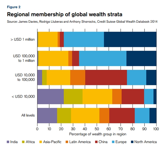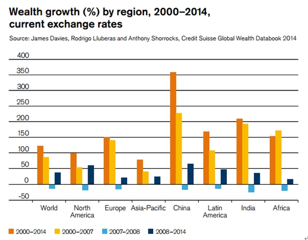 自从2000年以来,中国的财富增长十分强劲。这个世纪初期的时候,印度和非洲跟中国的差距并不大,但自从2007年人民币越来越坚挺,中国的财富增长率于是就甩了他们几条街。