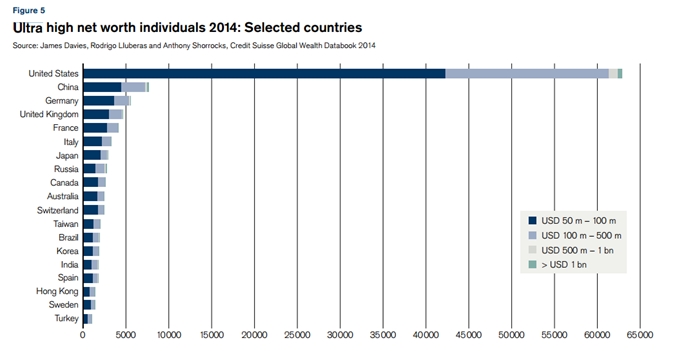 全世界总共有128200的超高净值人群,他们的净资产(以美元计,下同)都在5000万美元以上。随着中国不断出现陈欧、马云这样的人物,中国共有7600人挤进这一行列,占全球超高净值人群的6%,仅次于美国。