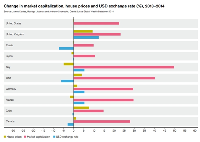虽然全球经济总体依然疲软,但全球财富总量却一直在增长,并在过去的一年中达到顶峰。报告称,2013年中期到2014年中期,全球财富增长8.3%,达到创纪录的263万亿美元,这比金融危机爆发前的最高水平还要超出20%,比2000年翻了一番。但与此同时,包括中国在内的许多地区财富分配不均的现象也进一步加剧。