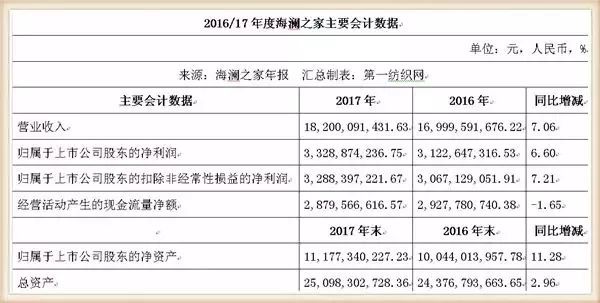 国民男装品牌——海澜之家股份有限公司(以下简称“海澜之家”)的多元化扩张之路终于迎来丰硕成果,3月23日晚间,海澜之家公布的2017年年报显示,报告期内,海澜之家实现营业收入182亿元,比上年同期增长7.06%;归属于上市公司股东的净利润33.29亿元,同比增长6.60%,基本每股收益0.74元/股,比上年同期增长5.71%。公司最新分配方案为每10股派发股息人民币4.80元,股息率4.27%。