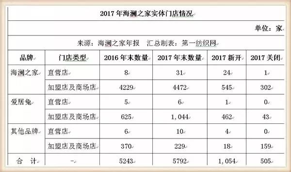 报告期,海澜之家新开店门店1054家,关店505家,净增549家,截止2017年12月末,公司门店总数5792家,其中“海澜之家”品牌4503家,“爱居兔”品牌1050家,其他品牌239家。