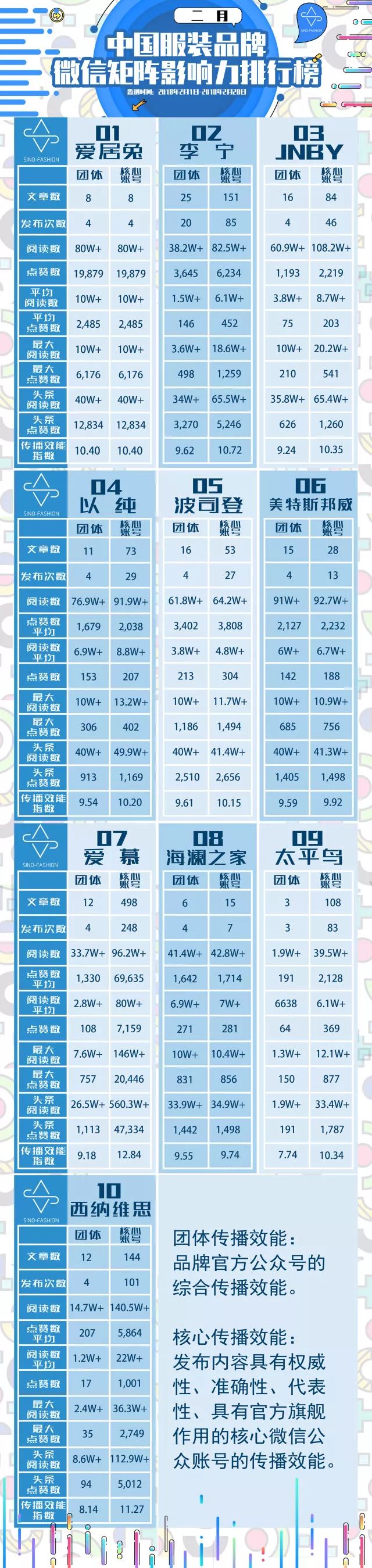 本期榜单的数据来源:中服·新榜数据库中2月1日0:00至2月28日24:00的所有服装品牌微信公众号的发文。作为排名依据的中服·新榜微信指数,由各服装品牌微信的各项原始传播数据加总、取均值并标准化处理后,参照权重计算公式推导而得,数据维度包括:总阅读数、平均阅读数、最高阅读数、头条阅读数、点赞数。