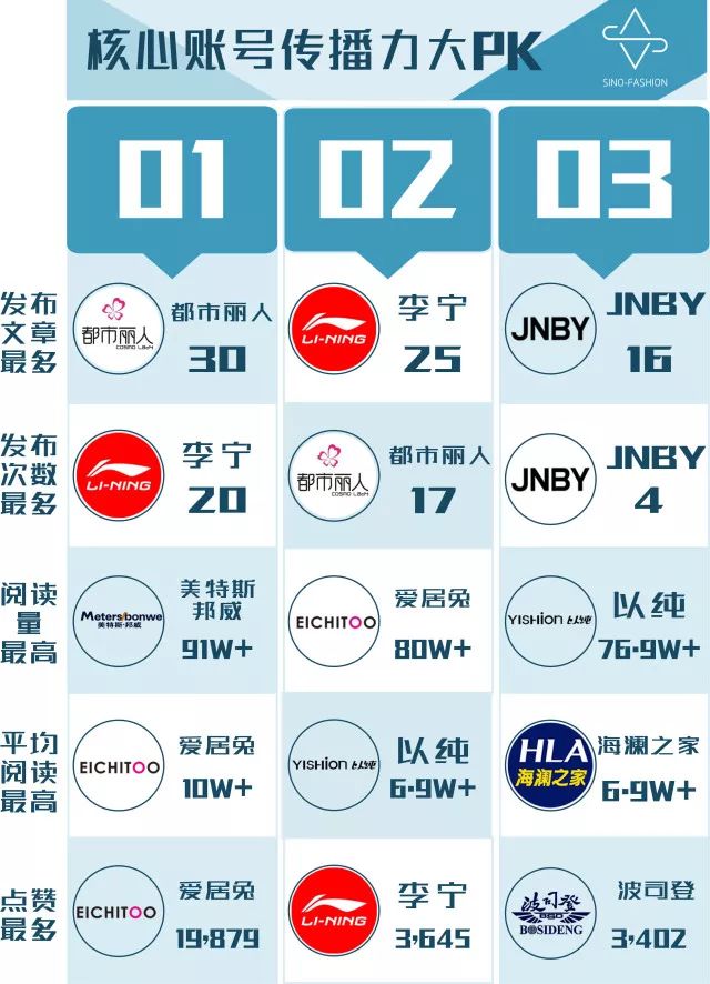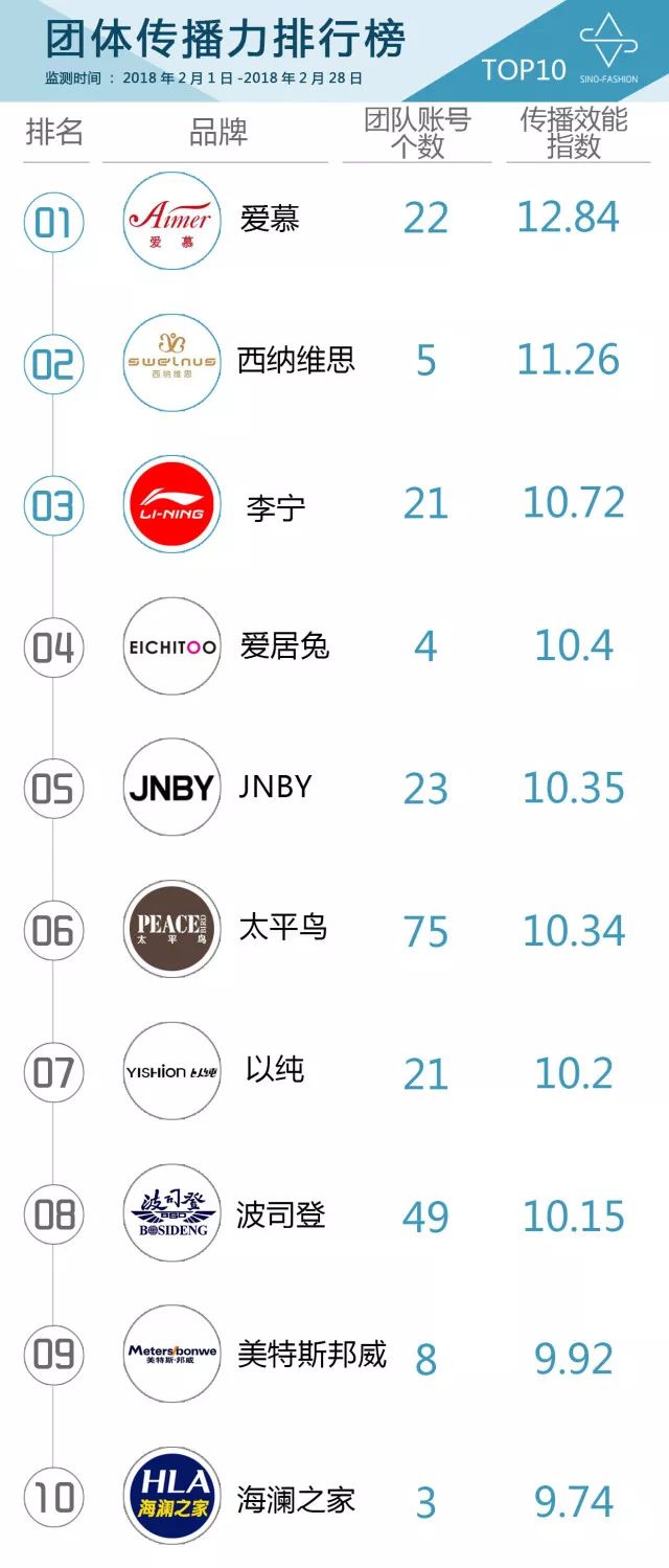 此次曾位居榜首的安踏掉出TOP10外,爱慕以12.84的高分拿下第1 ,太平鸟团队账号个数最多,排名第6,还需努力。