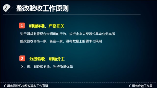 前述负责人在介绍《广州市网贷机构整改验收工作方案》(下称《整改方案》)时表示,广州整改验收工作坚持质量优先,对于网贷监管规定未明确的行为,将按资金流向穿透式界定业务实质,严格把关,整改验收合格一家、备案一家,没有数量上的要求与限制。