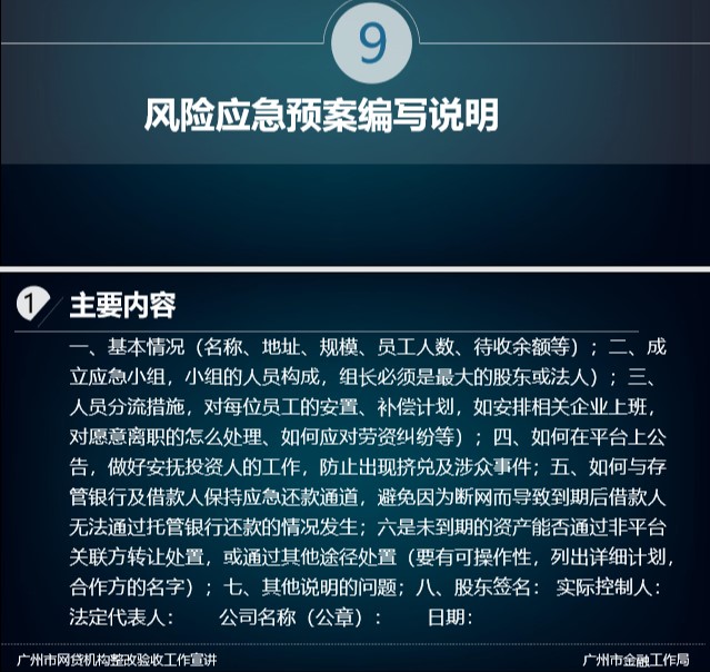 值得注意的是,广州网贷机构的验收申请资料中,除了需提交自评报告,相关专项审计报告等外,为了预防、妥善处置和化解未通过验收网贷机构后期风险或网贷机构验收备案后发生涉众事件等风险,还需提交风险应急方案,对风险发生时,“如何做好投资者安抚工作,防止出现挤兑涉众事件”、“应急还款通道”、“未到期的资产处置”等问题作出安排。