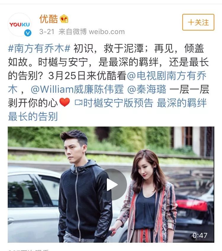在正在播出的电视剧《南方有乔木》中,从剧集未播之前的先导片花开始,剧方就侧重对陈伟霆、秦海璐感情线的宣传,现在更是把陈伟霆身材等各个方面当作宣传点,而鲜见对女主的宣传。