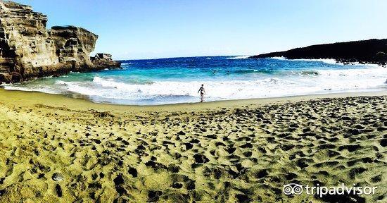 这是世界上仅有的两处绿沙滩之一,绿沙滩的主要成分是是橄榄石。远远看去,就像一片柔软的草地连接着蓝色的大海,这“抹茶绿”比草地更加层次丰满和细腻。当地有一个传说,绿沙的橄榄石是火山女神的眼泪,如果把她的眼泪私自带走就会发生不好的事。这里是美国的最南端,有美丽的火山悬崖,站在悬崖上看绿沙滩和大海。