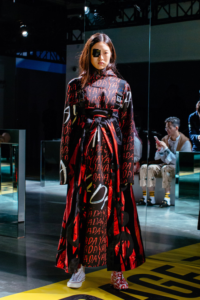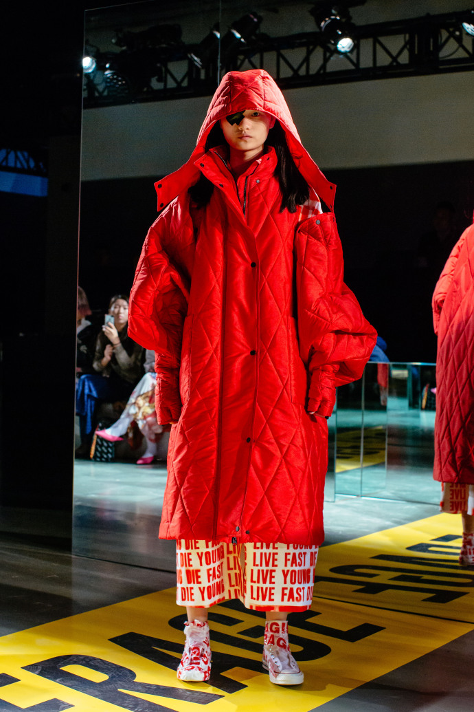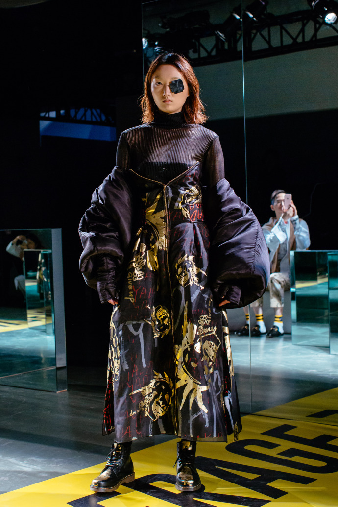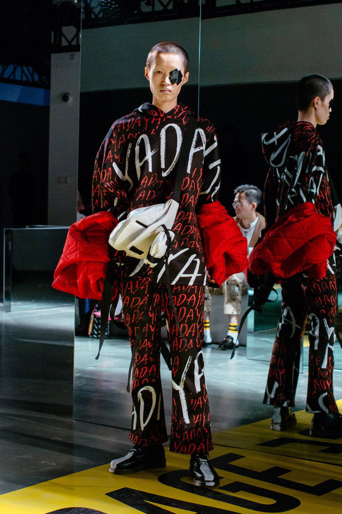 设计师Ying Shen说自己想要的感觉就两个字——炸裂,所以她设置了有许多镜面装置的秀场,衣服上有超大Logo和Slogan、大面积的烫金印花,搭配黑、金、红、黄这些亮眼的色彩。