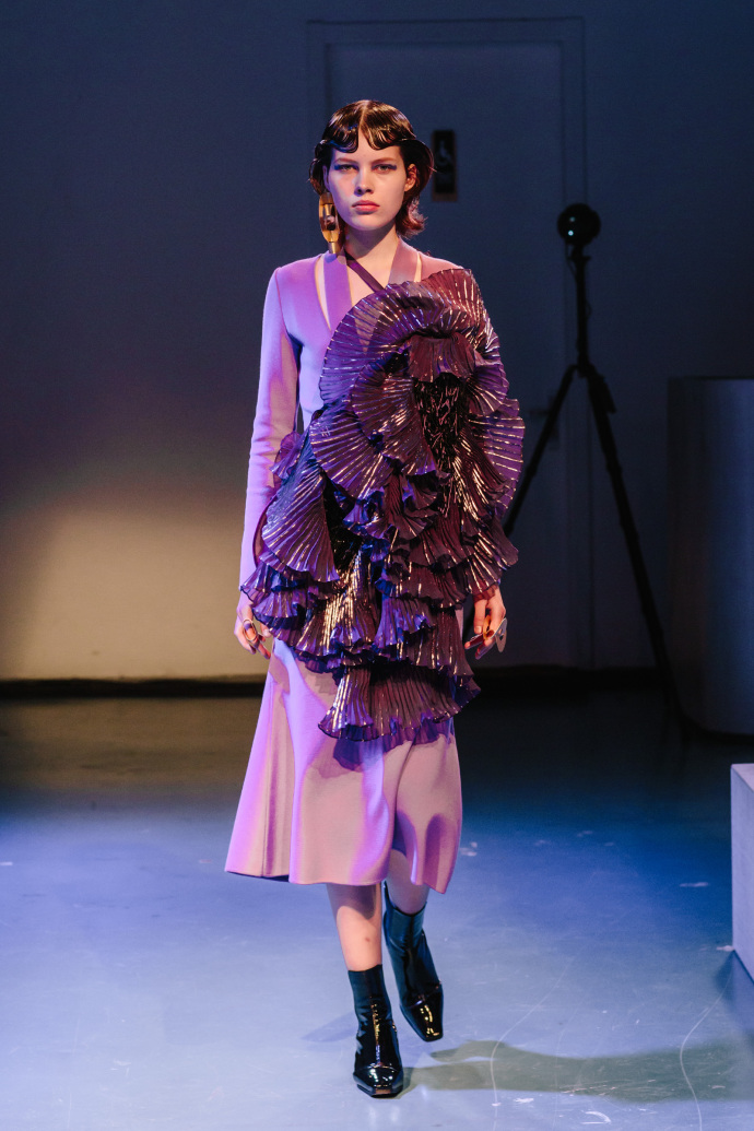 服装中,她用圆形纺织品雕塑呈现泥土与人体的交合转换,剪裁贴合女性身体曲线。色彩以紫、墨绿、芥茉黄为主,并采用了环保材质。软麂皮、色丁、金属涂层压褶等配以蜡面棉绳饰物让人联想到冬日的土壤和草地。