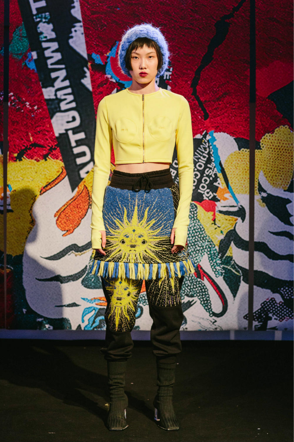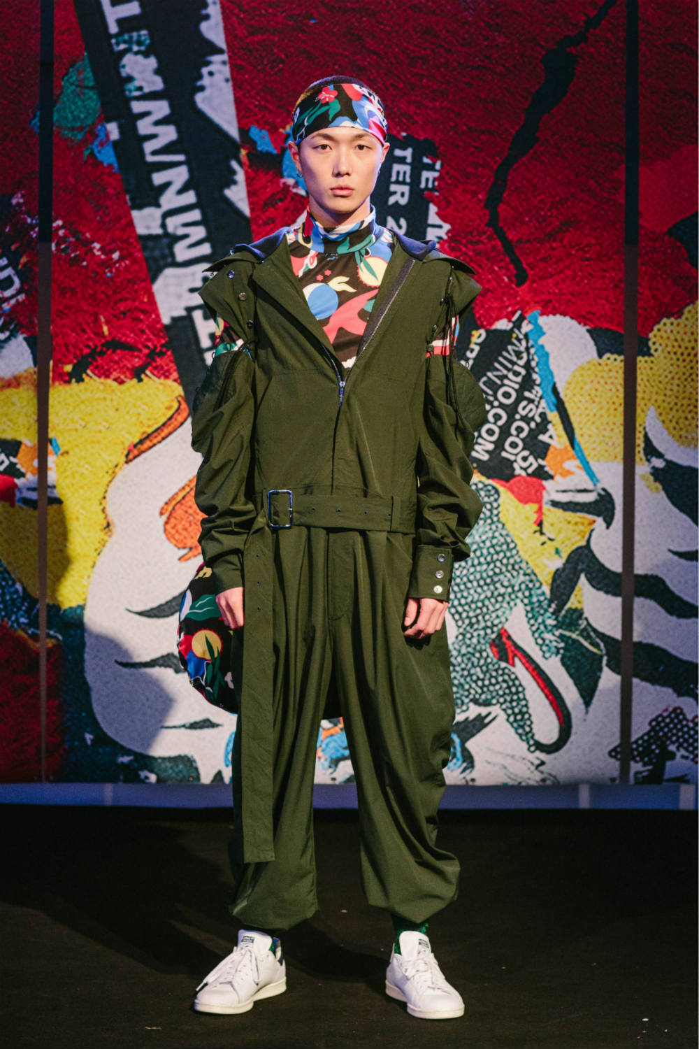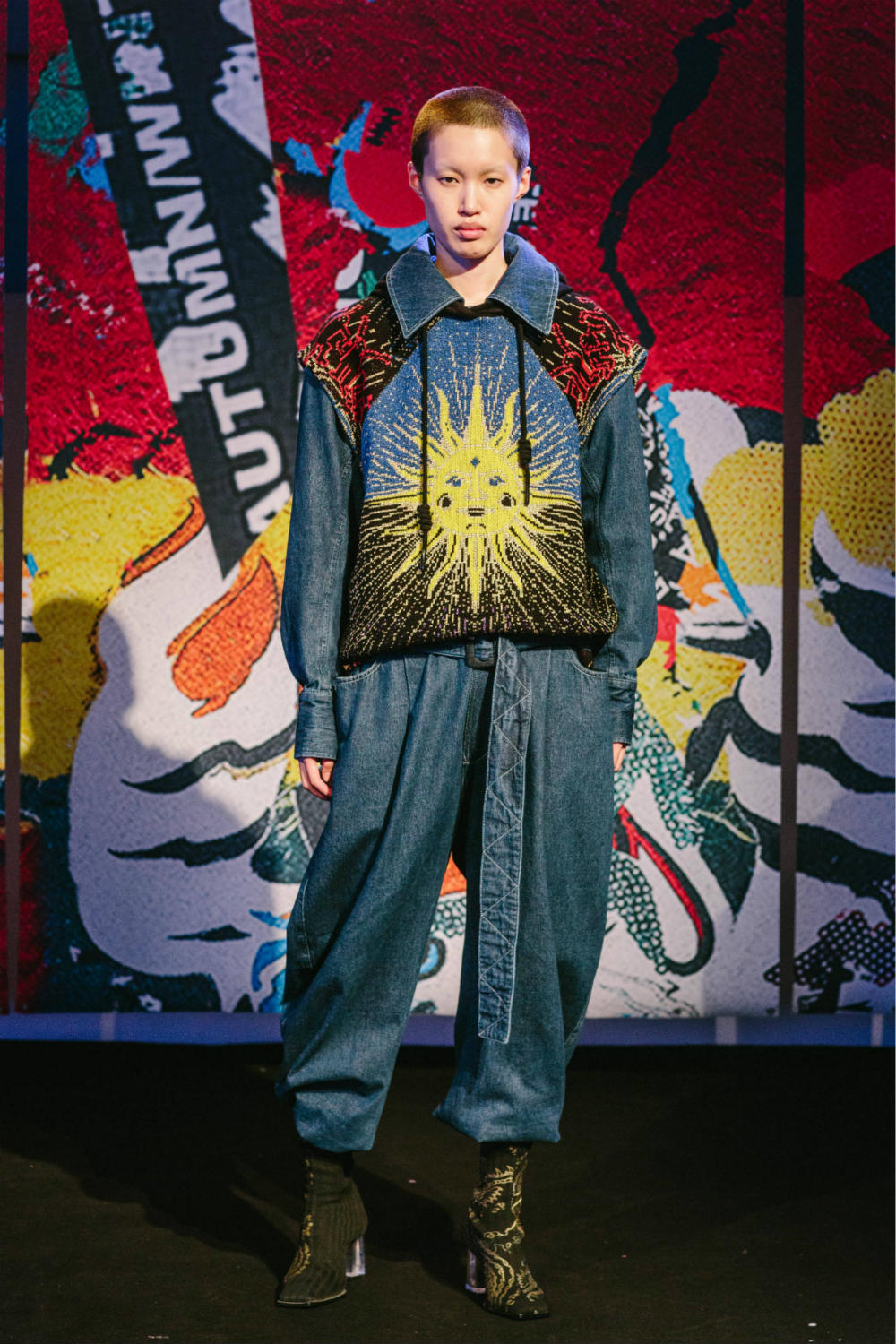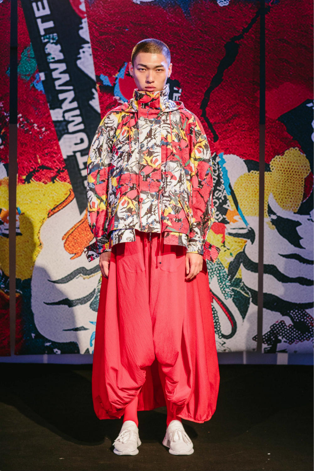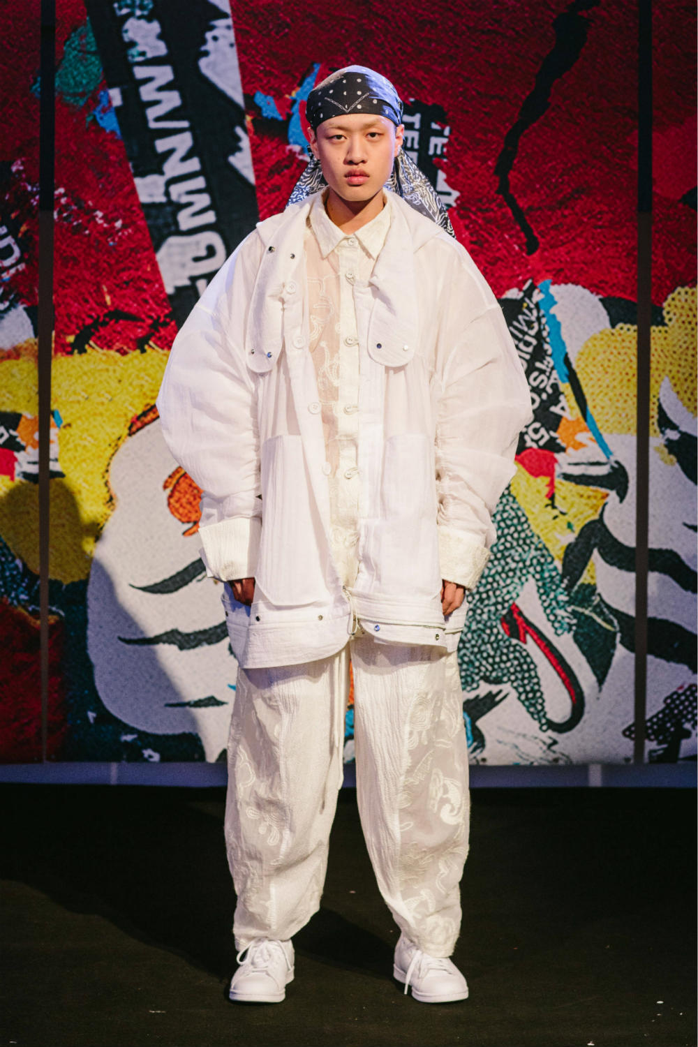 具有体积感的灯笼裤和灯笼袖在跳跃的颜色搭配下,也没有厚重沉闷感,太阳图腾的印花和抽象且多彩的图案成为每个造型的点睛之笔,头巾的细节设计融入了街头风格的元素,也是时下街舞舞者们最常见的搭配。在陈安琪的设计里,永远不会缺少当下最流行的元素,但她确能够赋予自己最独特的诠释。