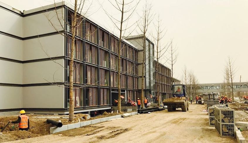 在施工现场,多栋装配式钢结构、模块化建筑已经封顶收尾。
