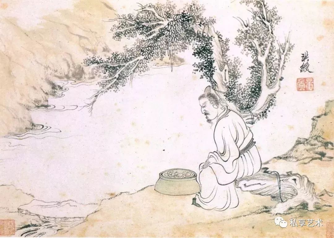 陈老莲的画中,主角可能是战国时期宋国的惠施,在政治失意时去访庄子,结成至友,才有了中国哲学史上的「濠梁之辩」。即惠子曰∶「子非鱼,安知鱼之乐?」庄子曰:「子非我,安知我不知鱼之乐?」画中那个访庄的人,像是陈老莲自己,他带着一颗出离心,去拜访理想中的精神所在。