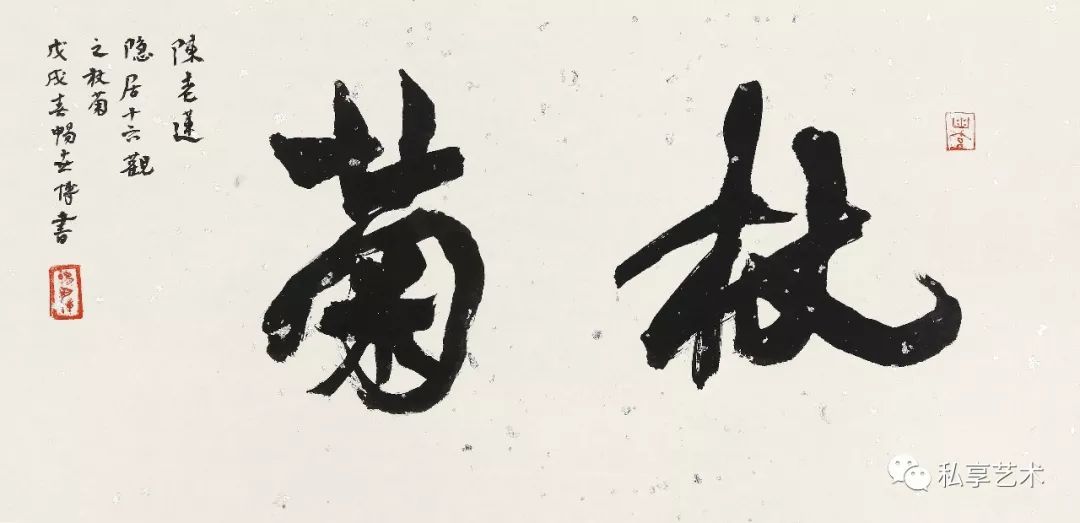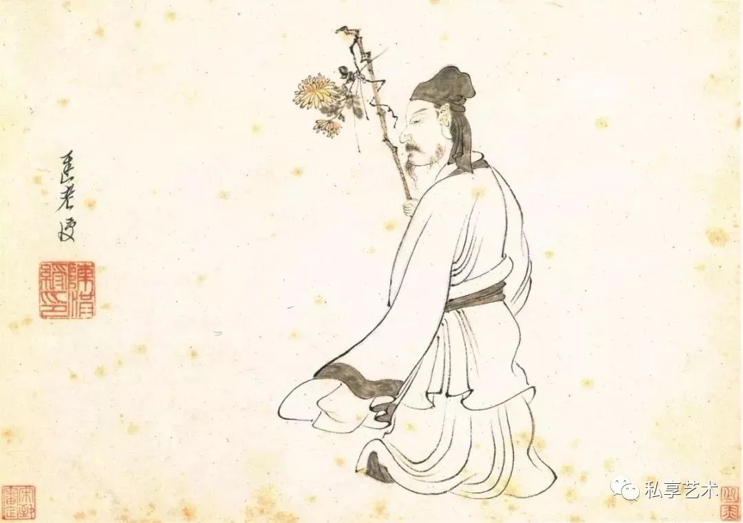 苏东坡有诗云「杖藜晓入千花坞」隐士持杖,纵游山水,于千姿百态的群花坞间沉醉。陶渊明爱菊,「采菊东篱下,悠然见南山。」杖头挂菊,则融入陈老莲的画面中。虬杖一根,隐士轻装而行,菊花三两,精神寄托于盛放花姿,跋涉江川,生命傲然之意卓然显见。