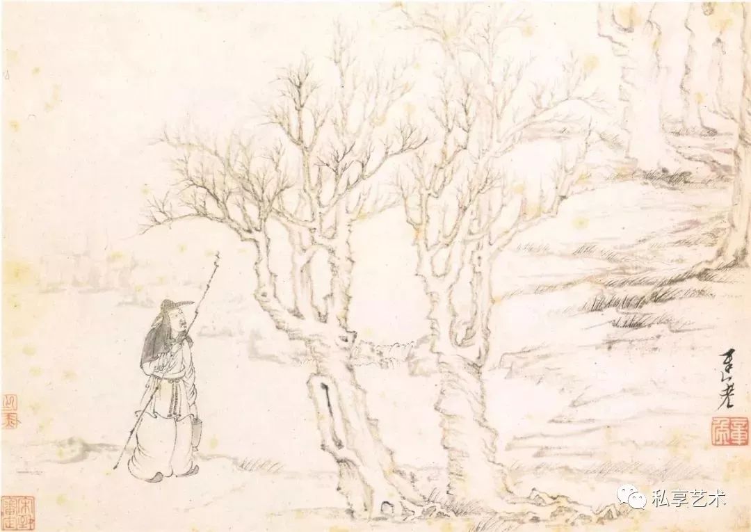 陈老莲画中的这个孤独来去的人,置身苍茫天地间,没有一花一木,一山一石。陶渊明在《归去来兮辞》中说「请息交以绝游,世与我而相遗……怀良辰以孤往,或植杖而耘耔。」