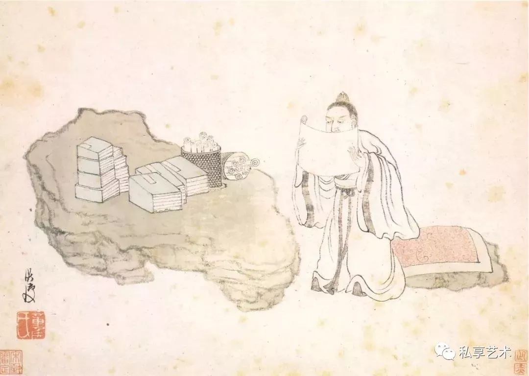 南朝画论家宗炳在《画山水序》中说:「圣人含道映物,贤者澄怀味象。」「澄怀」,荡涤胸中俗念,内心净澈,纯然无杂欲;「味象」,体味观照眼中的象。陈老莲的画中,赏画之人在青石旁专心赏味,仿佛精神已随着画卷行游其中,而对周遭事务无所感知。他手中的画卷绘了何种景致,外人无从得知,此时的「象」,只有他自己体会。