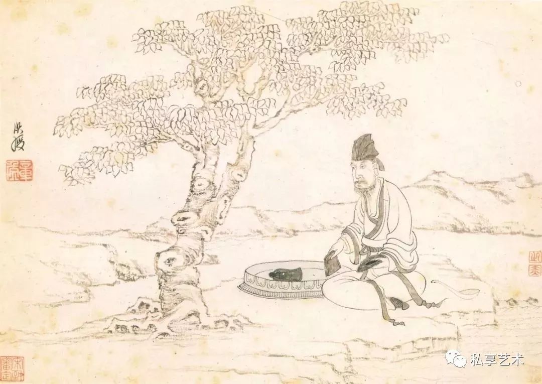 「囊幽」是一种自珍自惜,陈老莲画中主角是白居易,书箧在侧,琴囊在手。传说中仙人弄琴,凤栖梧桐,是很久之前的事。现在将琴音拟作仙方,与药炉茶鼎同效,调丝弦,称草药,一些不急不缓的病,都可治了。