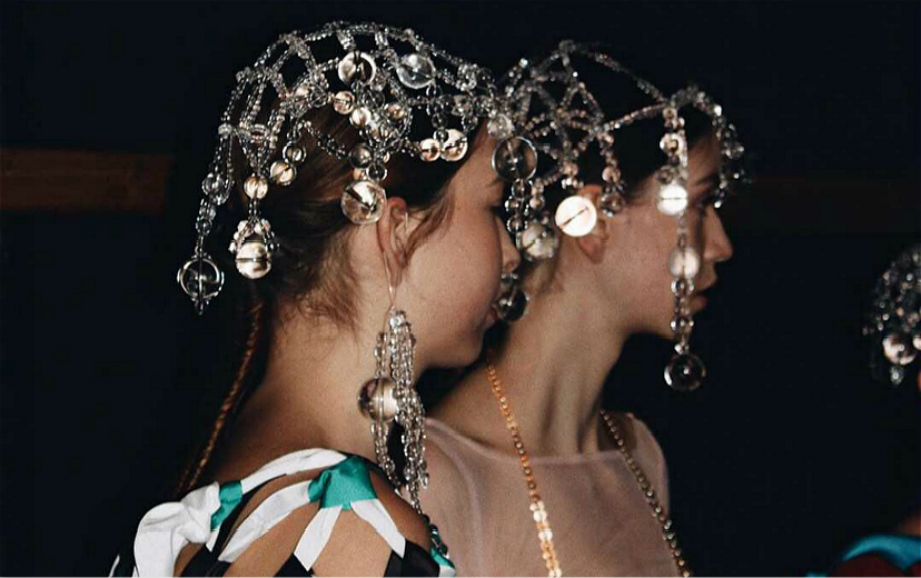 设计师Susan Fang喜欢从自然中寻找规律。因为在她看来,所有事物都是一种循环和重复,所以这一季选择了比较隐秘的、基础的韵律,尝试用编织的丝带去营造“有生命的面料”。“面料是3D的,然后可以从2D变为3D,就会让衣服也有不同的展现形式。“她说。这种放在行李箱里完全不会皱的面料会根据身体曲线变动,并用色彩去加重动态和对比,突出视觉效果。鞋子只有一款,就是最普通不过的凉拖,但Susan说主要想突出的其实是袜子。配饰方面主要突出头饰,透明的珠串被编织在一起,像是一顶帽子,走在灯光下闪闪动人。