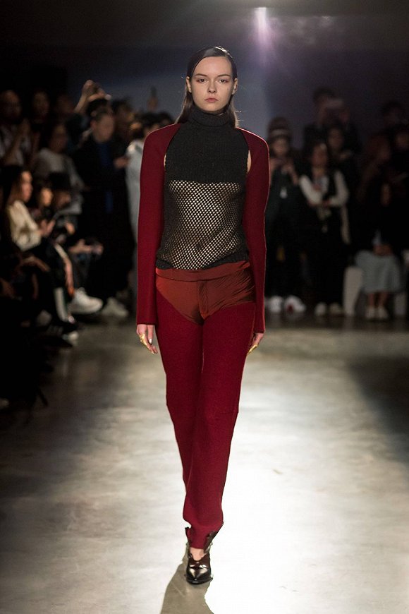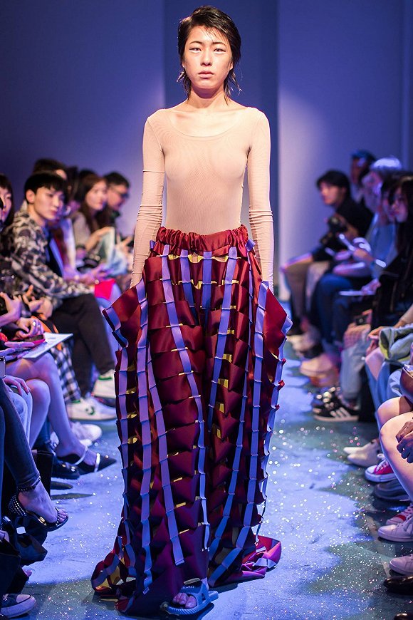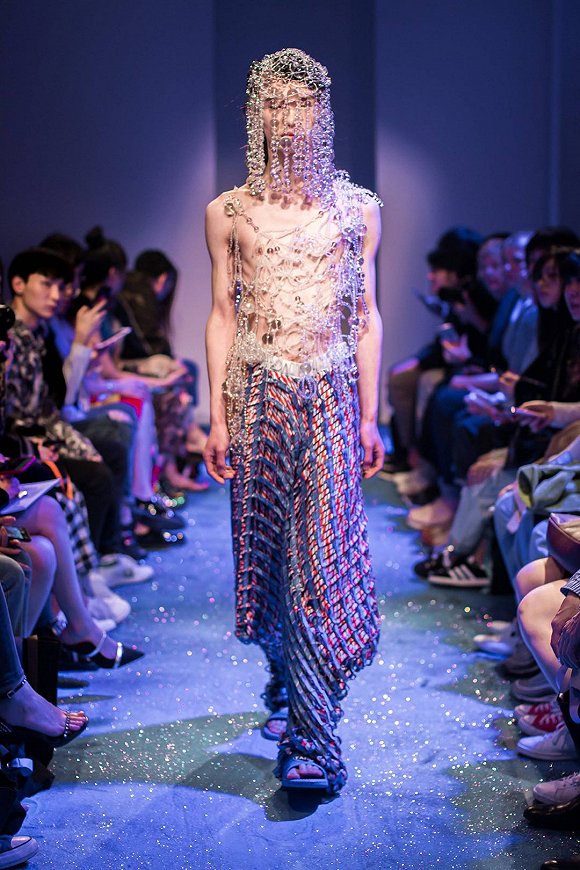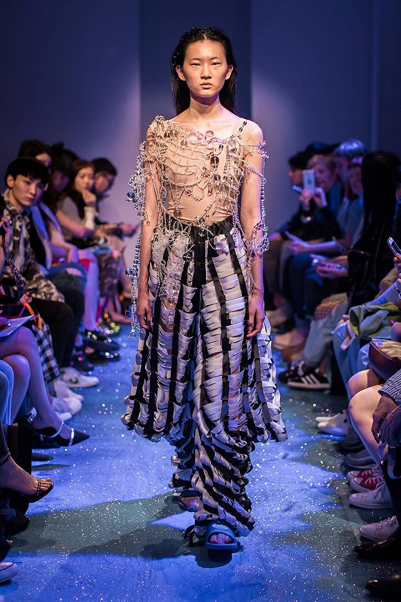 2018秋冬系列:选择了比较隐秘的、基础的韵律,尝试用编织的丝带去营造“有生命的面料”。这种放在行李箱里完全不会皱的面料会根据身体曲线变动,并用色彩去加重动态和对比,突出视觉效果。鞋子只有一款,就是最普通不过的凉拖,但Susan说主要想突出的其实是袜子。配饰方面主要突出头饰,透明的珠串被编织在一起,像是一顶帽子,走在灯光下闪闪动人。