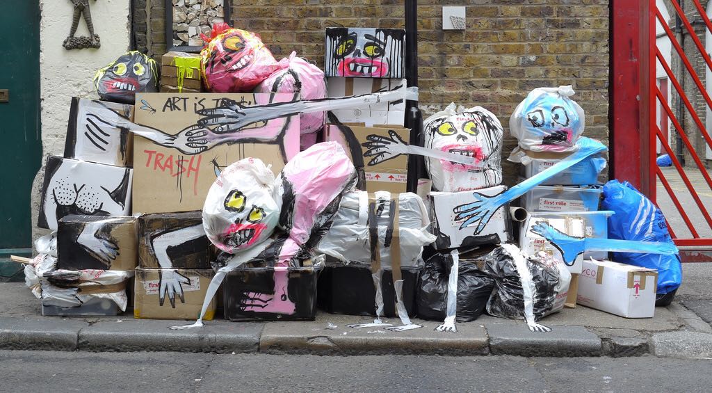 搬到伦敦之后住在东区,家附近就有很多古着店,还有很多街头涂鸦的人,我很喜欢去扣他们刚刚贴好的东西。那里还有个我很喜欢的西班牙艺术家Francisco de Pájaro,他到处写着”Art is Trash(艺术是垃圾)”,我就喜欢发掘这些。所以伦敦能给我很多灵感,因为在那儿很容易找到一些旧时代的东西。