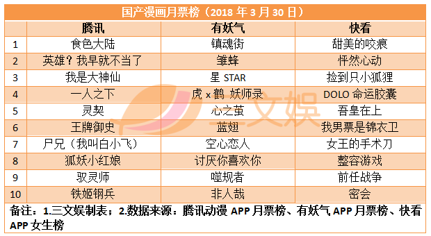 国产漫画方面,截至3月30日,根据腾讯漫画实时月票榜,上周登上榜首的是《食色大陆》,这部以美食、励志、穿越为主题的漫画以3647张月票荣登冠军,甩开第二名《英雄?我早就不当了》506票。而连续两周位居榜首的《我是大神仙》,上周退居第三。此外上周晋级榜单前十的还有两个新面孔——《狐妖小红娘》和《铁姬钢兵》,这两部漫画都是高评价高人气值。其他作品都是长期位居榜单,人气和热度都是有增无减。